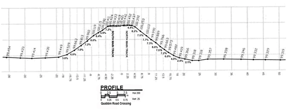 A post-accident survey by TSB investigators revealed that 4 of 5 crossings examined in the vicinity of Quabbin Road had approach grades greater than or equal to 5 per cent.