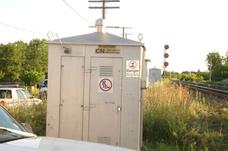 The driver attempted unsuccessfully to reverse. Then, the following 20-ton water truck was moved close to the lowboy truck. A chain was attached and another unsuccessful attempt was made to move the truck. These actions took approximately seven minutes. None of the vehicle drivers had noticed the 1-800 emergency number posted on the signal bungalow (see Photo 3).