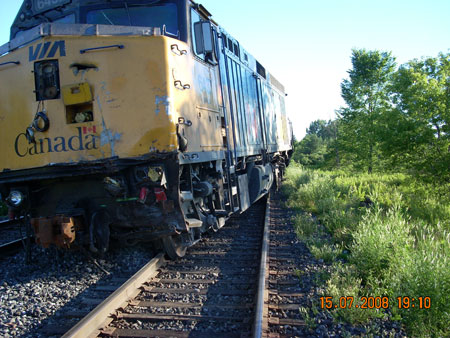 On 15 July 2008, at approximately 1525 eastern daylight time, VIA Rail Canada Inc. passenger train No. 60, travelling eastward on the north main track of the Canadian National Kingston Subdivision, struck a loaded tractor-trailer immobilized at the public crossing at Quabbin Road, Mallorytown, Ontario, and derailed. The locomotive engineer had applied the brakes, but the train was unable to stop before colliding with the tractor-trailer. The trailer and equipment it was carrying was destroyed. The truck driver had exited the tractor before impact and escaped unharmed. The operating locomotive engineer and four train passengers received minor injuries.