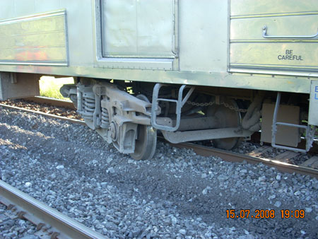 Approximately 2500 feet of the north main track was damaged, resulting in the replacement of around 600 ties. The locomotive sustained severe damage to its front end, and its running gear (see Photo 6a). The baggage car sustained damage to its lead truck (see Photo 6b) and to its interior flooring.