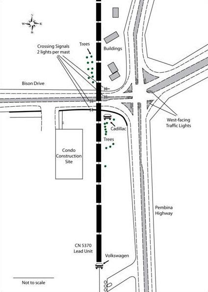 Drivers travelling eastward had continued over the railway tracks while the signals were operating and proceeded through the Pembina Highway traffic intersection. An eastbound vehicle had just cleared the median lane in front of the train when the following Volkswagen was struck by the lead locomotive.
