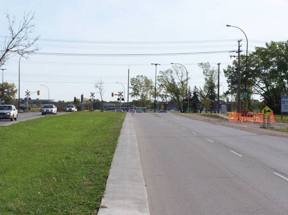 The posted speed on Bison Drive was 60 km/h in the vicinity of the crossing. Weekday traffic (2004 counts) averaged 18 300 vehicles per day, with 9450 of those vehicles travelling eastward. Since 2004, there had been significant residential and commercial development in the area. Bison Drive is the main entrance into the University of Manitoba.