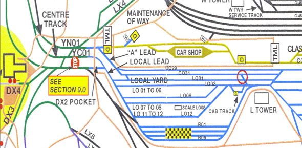 Track R09 extends from track LO02 just east of the derailment area and was available to be used as an alternate route to conduct switching operations. During wrecking operations, tracks CO30, CO31, and LO01 were locked, while tracks LO02, CO29, CO30, and R09 were not.