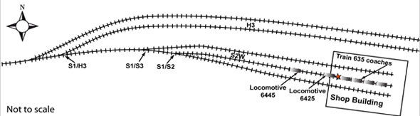 At 0018,Footnote 1 the crew was called by the yard controller and was instructed to exchange locomotive VIA 6425 with locomotive VIA 6445 on passenger train 635, stationed within the maintenance shop building (the shop) on track S2W (see Figure 1). At 0123, after finishing their switching operations in the east end of the MMC, the crew members stopped VIA 6425 in track H3 adjacent to the shop, where the CH detrained. He then uncoupled VIA 6445 from train 635 and proceeded west past the S1/H3 turnout. Locomotive VIA 6425, controlled by the ICH, followed on track H3, and stopped approximately 40 feet behind. The ICH applied the brakes on VIA 6425, exited the locomotive and instructed the CH to couple the locomotives.