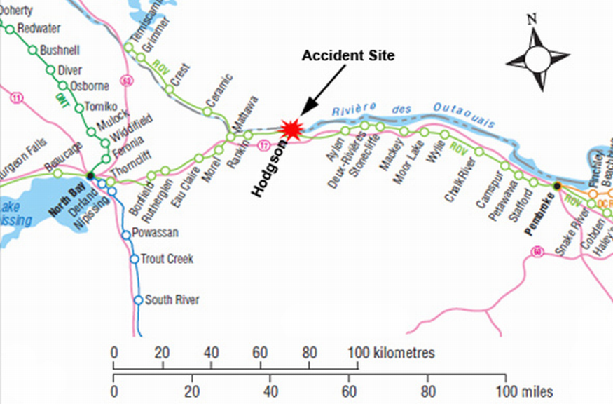 On 03 June 2009, at approximately 0300 Eastern Daylight Time, the Ottawa Valley Railway freight train, the Cobden Turn, travelling westward, derailed two locomotives and seven cars at Mile 60.1 of the North Bay Subdivision near Hodgson, Ontario. The locomotives overturned, resulting in minor injuries to the crew. Approximately 17 000 litres of diesel fuel leaked from the locomotive fuel tanks, most of which flowed into the Ottawa River.