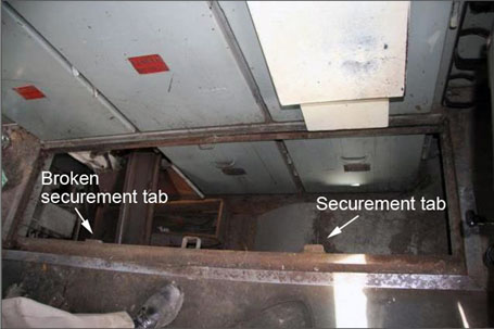 Inspection of the locomotive cab revealed that one of the floor panels had been dislodged and had broken free from the floor. The anchor for the securement mechanism of this panel had broken away (see Photo 2). The fracture face of the broken anchor had an accumulation of dirt from exposure to the interior subfloor and did not have the luster of a fresh break.