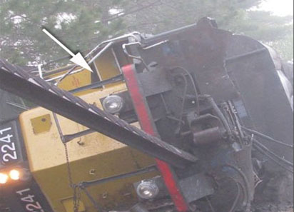 Inspection of the locomotive cab exit points revealed that the battery box lid had fallen open and was preventing the nose door from opening (see Photo 3). The rear exit door was buried in the mud. The cab was not equipped with an emergency exit hatch, nor emergency exit windshields.