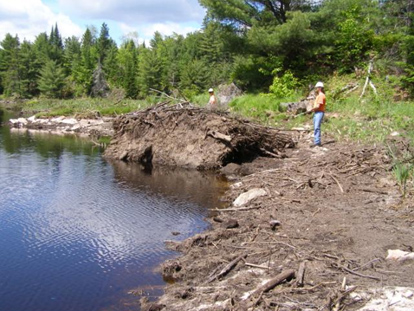 A nearby creek drained through a culvert in the track subgrade. The culvert was clear of debris and the water flow was unimpeded. A pond had formed bordering on the upstream side of the track subgrade. Water marks were discovered on the ballast, ties and rails approximately 10 feet above the water level that was observed after the accident. It was determined that the high water was due to the catastrophic failure of three beaver dams, up to 1.6 km upstream of the track; these dams were not visible from the OVR right-of-way. A large section of a beaver dam, measuring approximately 15 feet long, had been displaced from its location on a smooth bald rock (see Photo 4).