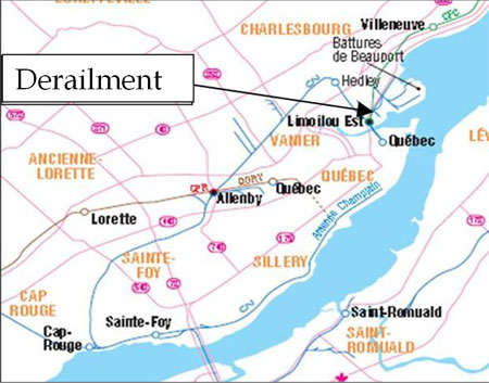 On 17 July 2009, at approximately 1900 eastern daylight time, Canadian National remotely controlled yard assignment YLUS-30 derailed five tank cars at Limoilou Yard in Québec, Quebec. A turnout and about 180 feet of track were damaged. No one was injured, but there was a minor fuel leak.