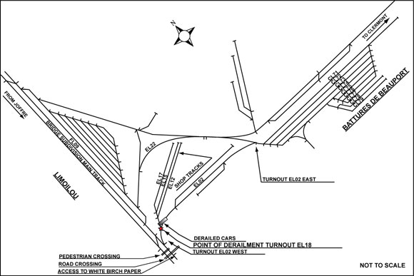At approximately 1900,Footnote 2 the assignment departed Battures de Beauport (east end of the yard) heading west on track EL02. It travelled about 1500 feet at a speed of 6 mph, and then entered track FL09. The assignment then began moving in reverse when an undesired emergency brake application occurred. The crew inspected the assignment and found that five tank cars containing aviation fuel (UN 1863) had derailed. The weather was cloudy, with good visibility, and the temperature was 21°C.