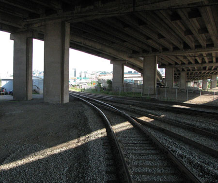 The TSB carried out a simulation in conditions similar to those prevailing on the day of the accident to determine the visibility distances of the yellow target on the switch stand mast. It was found that, from the helper's position, for a westbound movement on track EL02 approaching turnout EL18, the target on the switch stand mast remains hidden by a column of the Dufferin-Montmorency Highway viaduct structure for almost the entire distance (see Photo 1). It becomes visible only at a distance of 100 feet.