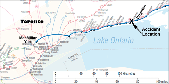 The train came to rest at Mile 247.20, near Brighton, Ontario (see Figure 1). The crew conducted the necessary emergency procedures and determined that six cars, the 98th to the 103rd, had derailed. The derailed cars included three dangerous goods tank cars (98th, 102nd and 103rd) loaded with molten naphthalene (UN 2304), one of which was on its side. No product was released and there were no injuries.