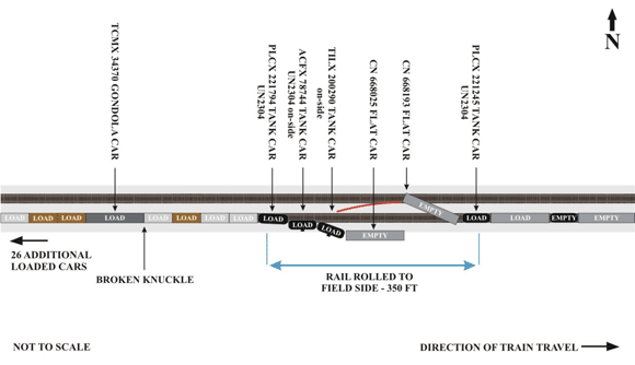 It is not uncommon for CN to marshal train M362 with loaded cars destined for Taschereau Yard on the tail end. Other than compliance with the Transport Canada (TC) Transportation of Dangerous Goods Regulations, there are no regulatory requirements for train marshalling or tonnage distribution within a train.