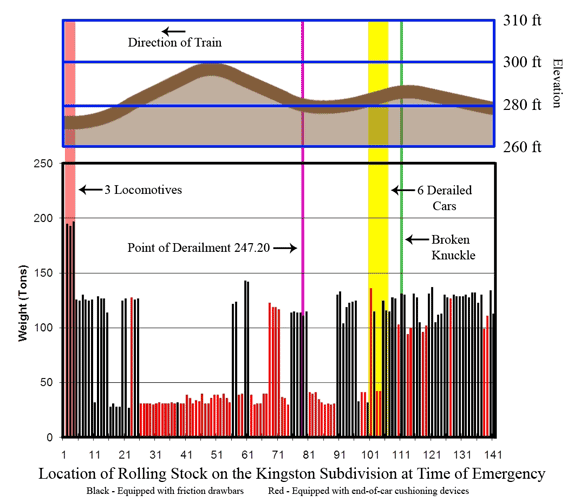 A tonnage profile of the occurrence train in relation to the track elevation and point of derailment is contained in Figure 3.