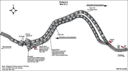 Despite the light rain and fog at the time, there was no indication that weather conditions were affecting the crew's visibility. At 2222, Train 355 passed Signal 565 and diverged into the siding at Redgrave East, travelling at approximately 29 mph (see Figure 2). This speed was maintained through the siding. The conductor did not question the locomotive engineer's train handling decisions through the siding. At 2225, Train 355 exited the left-hand curve (in the direction of travel) approaching Signal 581D, at Redgrave West. The view of the signal was limited to about 400 feet because of the presence of Train 110 on the adjacent main track. The crew observed the Stop signal indication and noted that the tail-end of Train 110 extended beyond the switch to the west on the main track. An operator-initiated emergency brake application was made. Train 355 continued past the signal and through the switch, striking the side of stationary Train 110 while travelling at about 22 mph.