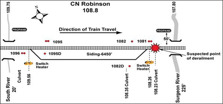 - The train derailed just east of the Robinson east switch, likely due to the collapse of the sub-grade and/or rail failure in the vicinity of a mud hole.