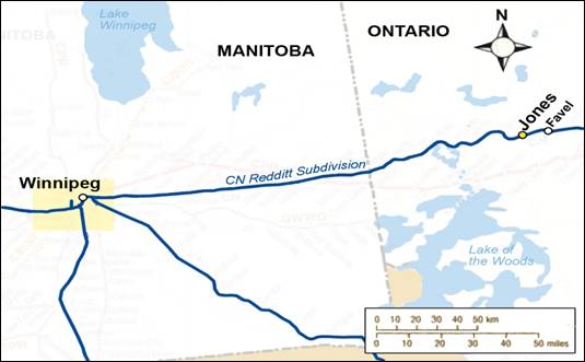 On 27 June 2009, the Redditt Subdivision sustained heavy rain and winds ranging from 27 km/h to 37 km/h. As a result of the severe weather, power outages occurred throughout the subdivision for extended periods of time. Throughout the early morning of 28 June 2009, power off indications were displayed on the rail traffic controller (RTC) screens. After these conditions were reported to Canadian National's (CN) signal department and the hydro company, it was determined that the area including Favel (Mile 99.30) and Jones (Mile 106.00), Ontario, would be without main power for up to 24 hours (see Figure 1). Signal maintainers were sent to those locations to deal with the signal problems. They worked through the night to address the power outages. Because of the power outage, the Redditt Subdivision RTC was unable to line signals in the field and had to issue several Canadian Rail Operating Rules (CROR) Rule 564 (d), "Authority to Pass Stop Signal at Restricted Speed"Footnote 1 to trains at various locations.