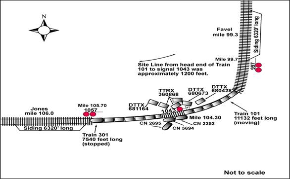 As Train 301 approached Favel (Mile 99.30), it encountered a stop signal and was brought to a stop. The RTC issued a CROR Rule 564 (d), "Authority to Pass Stop Signal at Restricted Speed." The crew copied the authority, after which the train departed and proceeded to Jones at restricted speed. The RTC indicated that Train 301 would likely encounter a stop signal at Jones and that a signal maintainer would likely be working to restore signal 1057 at Jones East (Mile 105.79). On arrival at Jones East at 0610:00, Train 301 encountered extinguished signals and came to a stop with its tail end just west of signal 1043 (that is, advance signal to Jones East) located at Mile 104.25.