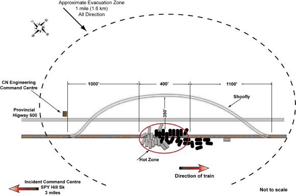 Shortly after the accident, the rural municipality of Spy Hill activated its emergency plan and various agencies, including local volunteer fire departments, the Royal Canadian Mounted Police (RCMP), the Saskatchewan Office of the Fire Commissioner and the Saskatchewan Ministry of Environment arrived at the scene. By 1445, ERpersonnel had evacuated all residents within a 1.6 kilometre radius of the fire and secured the derailment site. Provincial road 600, which runs parallel and adjacent to the railway tracks, was closed and the site perimeter was secured by the RCMP and CN Police.