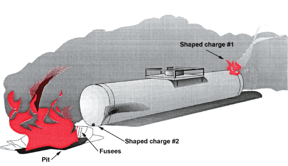 The procedure itself involves placing 2 explosive charges on the affected tank car. One charge is placed at one end of the car on the highest point, which is typically the "vapour space". The other charge is placed at the opposite end of the car at the lowest point, which is typically the "liquid space". The vapour space charge is first ignited. The charge creates a hole in the tank shell, ignites the vapours as they vent to atmosphere and relieves pressure in the tank. Once the pressure has been relieved, the second charge is ignited. This opens a hole in the liquid space, which allows the liquefied gas to drain out of the tank into a pre-excavated pit area where it is burnt off to atmosphere (see Figure 3). Considerable expertise is required to handle, set and activate the charges without the catastrophic destruction of the tank car.
