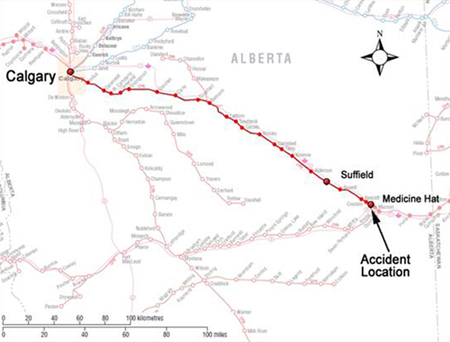 On 03 February 2010, eastbound Canadian Pacific Railway (CP) freight train 292-02 (train 292) operated on the Brooks Subdivision (see Figure 1) from Calgary, Alberta (Mile 175.8) to Suffield, Alberta (Mile 26.5) where it picked up 27 empty auto carrier cars and placed them on the head end directly behind the locomotives. After the cars were added, the train consisted of 2 locomotives, 53 loads and 49 empties; it weighed 8983 tons and was 7298 feet long. The train then proceeded to Medicine Hat, Alberta (Mile 0.0) for a scheduled crew change.
