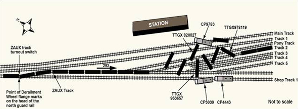 The first car, TTGX 978119, had its rear truck derailed; the following 6 cars had all of their trucks derailed. The 16th car, TTGX 963657, derailed southward from track 2, striking and derailing yard service locomotive CP 3039 which was stationary on shop track 1. As a result, the fuel tank of CP 3039 punctured and diesel fuel spilled onto the ground. The yard assignment locomotive engineer, who was in the cab, was not injured.