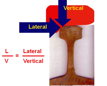 L/V ratios quantify the relationship between the weight of the locomotive or railcar bearing down on the rail through the wheel interface (i.e., vertical force) and the force of the wheel flange pushing out on the rail (i.e., lateral force). The single wheel L/V ratio can be used to predict the risk of the wheel climbing the gauge face of the rail or lifting off the rail. Circumstances in which a car is operating with high lateral force and low vertical force can result in a wheel climb event and derailment. For normal flange/rail contact conditions, a wheel L/V ratio of 1.5 can cause wheel climb.