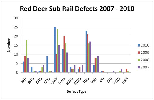 The Railway Track Safety Rules require Class 4 track to be inspected for internal defects at least once per year. However, according to CP's Standard Practice Circular (SPC) 27, Rail Testing Frequency and Remedial Action for Defective Rails, the Red Deer Subdivision would have required 2 tests per year. For this track, the frequency of inspections exceeded the TSR and SPC requirements.Footnote 13 Test records indicate that there were 3 ultrasonic rail tests conducted on the Red Deer Subdivision prior to the derailment, with a total of 6 tests performed in 2010. Appendix A summarizes the results of the past 4 years of rail defect testing on the Red Deer Subdivision. There were no in-service rail failures and no rail defects detected in the vicinity of the derailment by the tests performed prior to the derailment.