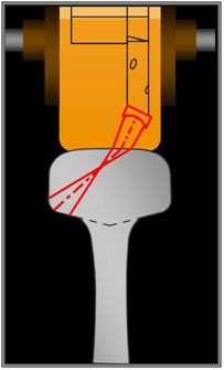In addition to the B-Scan system, Car 965 is also equipped with the X-Fire system that incorporates 2 additional transducers per rail that optimize the ultrasonic entry point, angle (17° to the gauge face) and skew to avoid surface anomalies. The system improves the detection of oddly oriented transverse defects and the detection of TDs under shells that the standard angle transducers would normally miss.