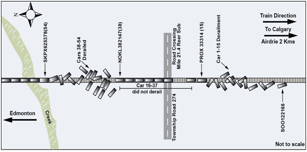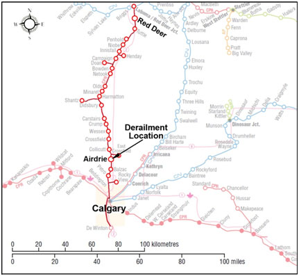 Canadian Pacific Railway (CP) freight train 2-269-02 (the train) consisted of 2 General Electric AC 4400 operating locomotives, 82 loads and 19 empties. It weighed 10,786 tons and was 6311 feet long. No irregularities or problems with the train were noted between Red Deer and Airdrie, Alberta (see Figure 1).