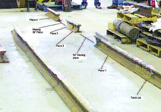 The 467 inch long section of the west rail consisted of 6 recovered pieces and 2 voids (see Photo 1). From north to south, there were 3 mating pieces (including Piece 1) measuring 272 inches long followed by a void of 54 inches. Then, 2 mating pieces 44 inches long (Pieces 2 and 3), another void measuring 36 inches long and then a piece of rail 61 inches long (Piece 4). The 3 pieces recovered south of the 1st void (i.e., Pieces 2, 3 and 4) and the POD displayed batter consistent with the train's direction of travel.