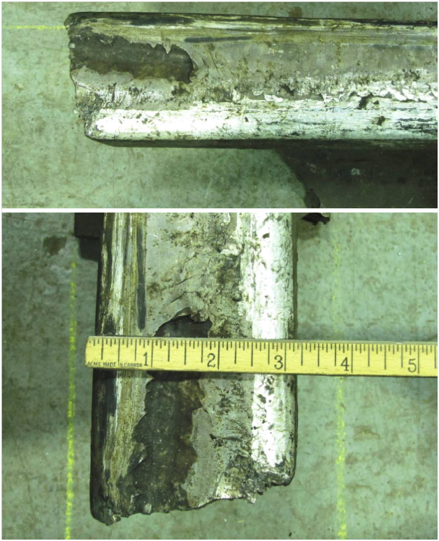 A total of 825 inches (68 feet- 9 inches) of rail (358 inches of the east rail and 467 inches of the west rail) was subject to failure analysis. Both rails had vertical wear and gauge wear of approximately 3⁄32 inches and 5⁄16 inches, respectively. This amount of rail wear is under the line A wear limit for 115-pound rail (ref.: CP's Red Book of Track Requirements dated May 15, 2010; Section 17).