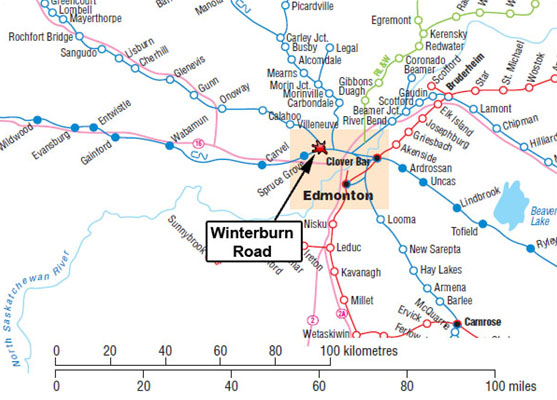 The road provides direct access between Highway 16 to the north and Highway 16A (Stony Plain Road) to the south. Sight-lines for southbound traffic approaching the crossing are severely restricted in the northeast quadrant by trees, brush and an industrial compound and in the northwest quadrant by a building and a compound. Sight-lines for northbound traffic are severely restricted in the southwest quadrant by an industrial compound and containers and in the southeast quadrant by brush and buildings. Average daily traffic counts on Winterburn Road in 2008 were 10,629 vehicles. The maximum permissible speed is 60 km/h.
