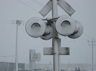 - For southbound vehicles, the presence of ice and snow was noted on the northward-facing warning lights, gate lights, and reflectorized materials. With the crossing protection operating, it was difficult to see light emitted from the northward-facing signals.Footnote 14