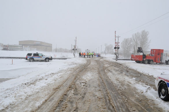 At the time of the accident, the temperature was just below freezing with high winds from the north to northwest at approximately 40 km/h, gusting up to 68 km/h with blowing and falling snow. It had rained throughout the night, turning into freezing rain and then snow in the early morning. Driving conditions and visibility were poor; the road surface was wet, slippery, and covered in fresh snow (see Photo 4). The crew reported that the north-facing right side window of the locomotive was iced up and covered with snow, and that the wipers had little effect in clearing the front window. Poor visibility prevented a clear view of the north side of the crossing.