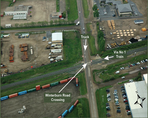 The crossing was protected by incandescent flashing lights, a bell and gates. Just prior to the accident, the crossing signals were working and northbound traffic on Winterburn Road was stopped at the crossing. The southbound truck arrived at the crossing and entered it at the same time as the train was entering it. At the time of the accident, the truck was the only southbound vehicle at the crossing.