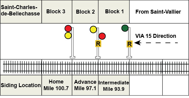 Train movements on the Montmagny Subdivision are governed by the Centralized Traffic Control System (CTC), as authorized by the Canadian Rail Operating Rules (CROR) and supervised by a rail traffic controller (RTC) located in Montréal. The CTC employs interconnected track circuits and field signals (controlled, advance and intermediate signals) to control train movements. Computer displays and controls are installed in the RTC office. The design of the system is such that trains are given a series of signal indications that require train crews to take action based on the signal displayed.
