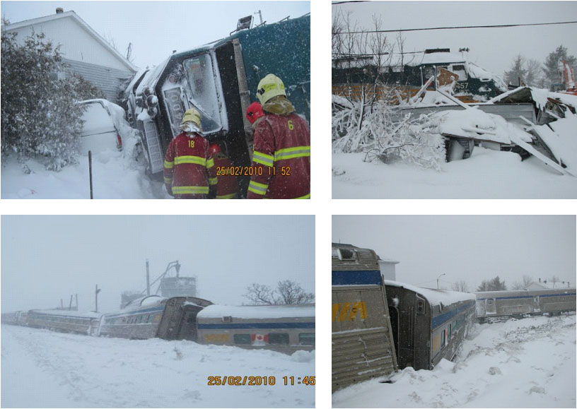 On 25 February 2010, at approximately 0425,Footnote 1 VIA 15, travelling at approximately 64 mph, entered a siding at Mile 100.78 of the Canadian National (CN) Montmagny Subdivision in the municipality of Saint-Charles-de-Bellechasse, Quebec, and 2 locomotives and 6 passenger cars of the train derailed. The derailing train downed adjacent hydro lines and struck 2 houses and a garage before coming to a stop (see Photo 1).