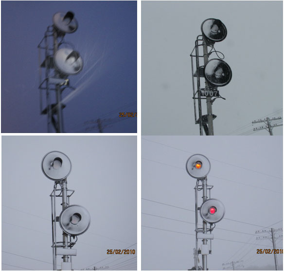 | 0356 | The crew members of CN 305, while operating west of Joffre on the Drummondville Subdivision, reported to the RTC that they were having difficulties perceiving the signals because of snow accumulation on the signal lenses. The RTC contacted the signal technician who then dispatched a team to clean the signal lenses in that area. | ||||