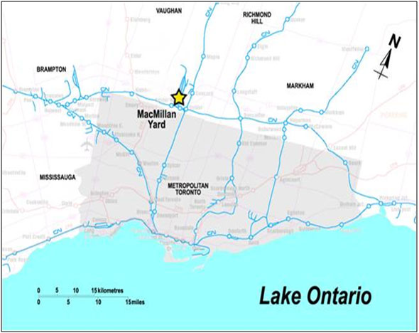At approximately 0530Footnote 1 on 09 February 2010, Canadian National (CN) yard switching assignment 0430 YEO (the assignment) was performing switching activities in CN's MacMillan Yard located in Toronto, Ontario (see Figure 1). The crew comprised a single conductor who used a locomotive control system (LCS) BeltpackFootnote 2 to operate a locomotive hump set consist. The assignment's locomotive consist was arranged with the controlling locomotive (CN 7504) located on the south end followed by two slave units (i.e., traction motor units with no locomotive cab) and a trailing locomotive on the north end (CN 7507).
