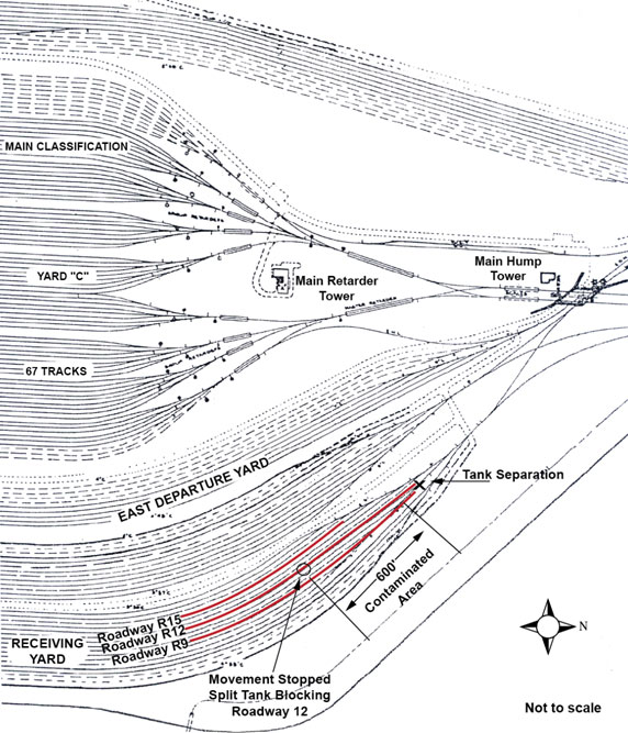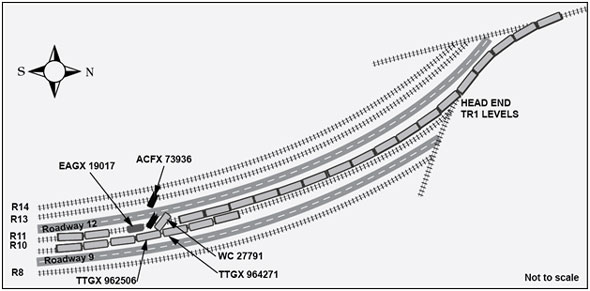 Damage observed along Roadway 12 and Track R-011 as well as the position in which the derailed cars came to rest showed that the derailment had occurred when the 17th car, DG non-pressure tank car ACFX 73936 loaded with ferric sulphate (UN3264), failed catastrophically near the middle of the car, and broke into 2 sections near the north switch of track R-011. As the assignment was shoved a further 600 feet southward, the failed tank car released its contents along Roadway 12 and the adjacent tracks.