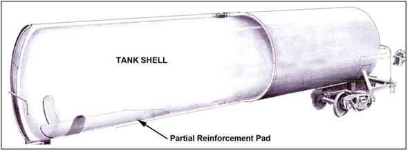 Tank car reinforcement pads (re-pads) provide localized reinforcement and skid protection for the shell as well as shear protection for appurtenances welded to them. This design feature is such that, in the event of a derailment, exposed appurtenances are meant to tear away from the re-pads and leave the tank shell intact. Each tank car is equipped with either:
