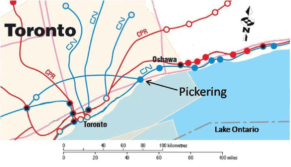 At approximately 1500 Eastern Daylight Time on 30 March 2010, Canadian National freight train M37631-30 was proceeding eastward from Toronto to Montreal, when 4of its locomotives and 11 of its cars derailed near the GO Train station at Mile 1.40 of Canadian National's York Subdivision in Pickering, Ontario. The fuel tank on one of the locomotives was punctured and released approximately 50 litres of diesel fuel which caught fire. The fire was quickly extinguished by the local fire department. There were no dangerous goods involved and no injuries.