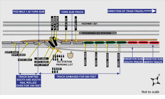 All locomotives and the first freight car (loaded covered hopper) had separated from the remainder of CN 376. The lead locomotive came to rest approximately 1000 feet east of the Liverpool Road overpass. The trailing truck of the first isolated locomotive, RBRX 18536, and all wheels of the following 3 isolated locomotives and the freight car were derailed. There was a short separation followed by the 2nd to the 11th cars which had also derailed. Five of the cars had jackknifed and were foul of both Kingston Subdivision tracks. A centre beam flat car, loaded with lumber, came to rest in the Pickering GO station parking lot (see Figure 2).