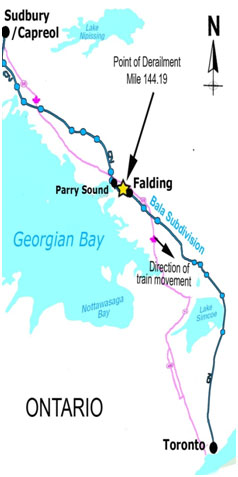 The Bala Subdivision is Class 4 single main track, which extends from Toronto (Mile 0.0) northward to Capreol (Mile 276.1). In the vicinity of the derailment, between Mile 142.3 and Mile 160.3, zone speed for freight trains had been permanently reduced to 40 mph (Class 3 track standards). Movements on the Bala Subdivision are governed by the Centralized Traffic Control System (CTC), as authorized by the Canadian Rail Operating Rules (CROR) and supervised by a rail traffic controller (RTC) in Toronto.