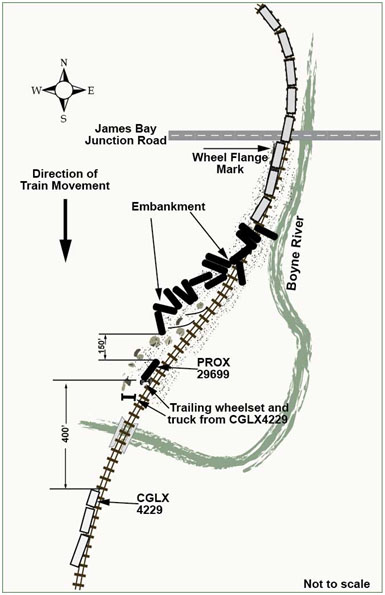 The following 15 loaded tank cars (52nd to 66th) had rolled and jackknifed in various orientations predominantly to the west of a 350 foot portion of elevated tangent track. In this area, the west rail had rolled and shifted to the west. The derailed tank cars slid down an embankment and came to rest in a swampy area where the track entered a 2° left-hand curve. The 66th car came to rest upright on the bank of the Boyne River east of the tracks. The 67th to 69th cars had derailed upright on the web of the canted west rail, and on the ties between the rails (see Figure 2).