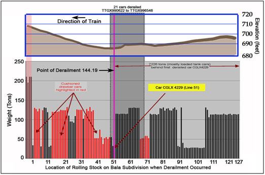 The derailed cars included TTGX 99062 - an empty multi-level auto carrier (line 49), NAHX 551057 - an empty 65 foot 32 ton covered hopper car (line 50), CGLX 4229 – an empty 40 foot long 27 ton aluminum covered hopper car (line 51), 15 loaded tank cars (lines 52 to 66), and 3 empty multi-level auto carriers (lines 67 to 69).