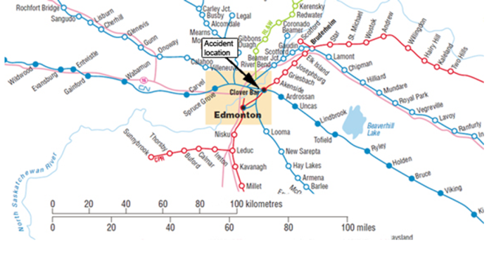 Train A417 originated in Clover Bar Yard in Edmonton and was travelling westward on the north main track to Walker Yard, also in Edmonton. As it had stopped for instructions from the Yardmaster, the tail end of train A417 was situated just west of the 50th Street overpass. Signal 2625N was situated just east of the overpass (Figure 2).