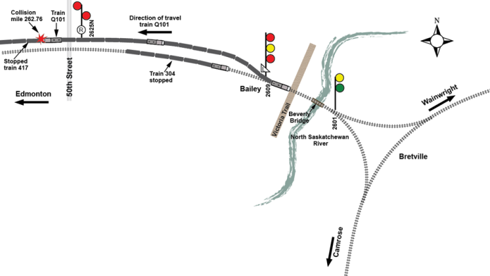 - Once a clear view of signal 2625N was established, there was insufficient distance for the crew to stop train Q101 before it collided with the tail end of stationary train A417.