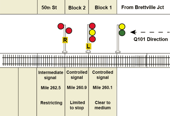 During the approach to the point of collision, the crew of train Q101 positively and correctly identified the signals. As train Q101 closed in on signal 2625N at 50th Street, it was operating on a limited to stop signal indication (signal 2609) that required the crew to be prepared to stop at the signal. The crew were aware that signal 2625N was an intermediate type signal that had an R letter plate affixed to the mast making its most restrictive indication a restricting signal.